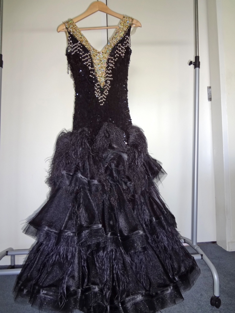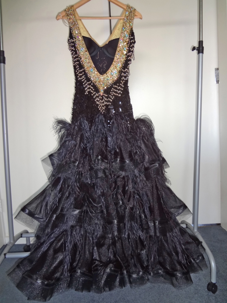 一人目の着用回数が多く、石落ち、金色ビーズの剥げなど着用感ありますのでお安くお譲りいたします。(胸、肩の金色部分とビーズフリンジのアップの写真を参考ください。)遠目からはわかりません。フロア脇で撮った写真の見た目のようにフロアでは見えます。