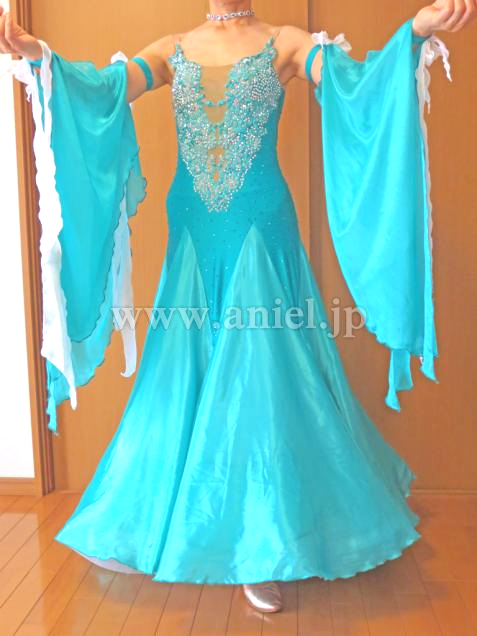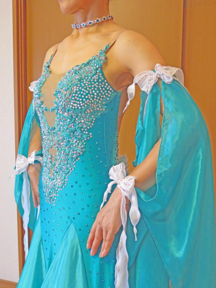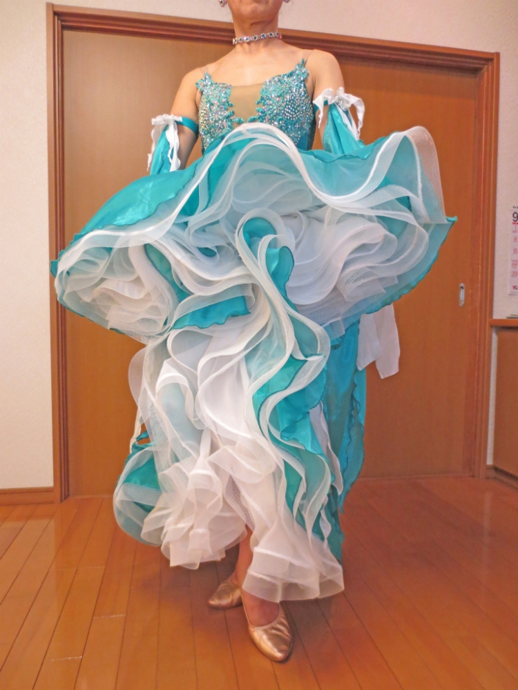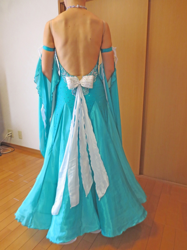 2013年8月に購入。スカートはクリスアンのサテンシフォンでとてもきれいな色です。石はスワロフスキーです。中の白いバニエがボリュームたっぷりで立っているだけでスカートが広がります。後の白いリボンが可愛いです。ファスナーはなく下から簡単に着られます