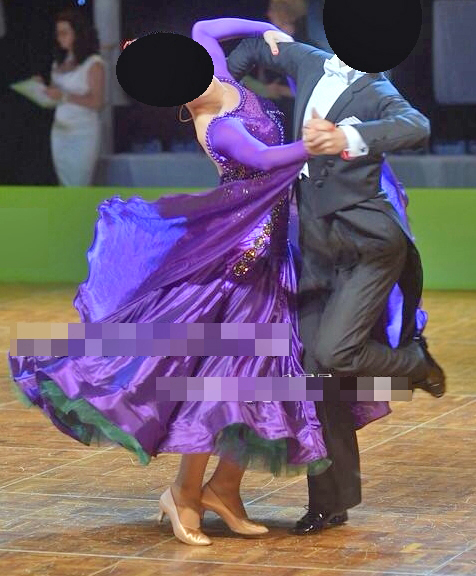 濃い紫のドレスです。袖があるタイプですので腕を露出したくない方にもおすすめです。スカートにはボリュームがあり、たくさんのスワロフスキーストーンやパールで飾られたボディはよく輝きます。クリスアンの生地が使われています。