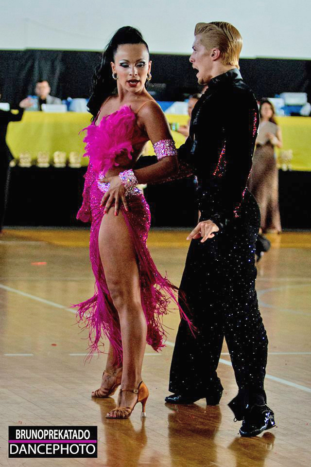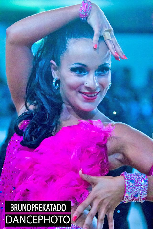 CBMの鮮やかなピンクのドレスです。フリンジや羽根がつけられ、ボディにはスワロフスキーのストーンがたくさん散りばめられています。