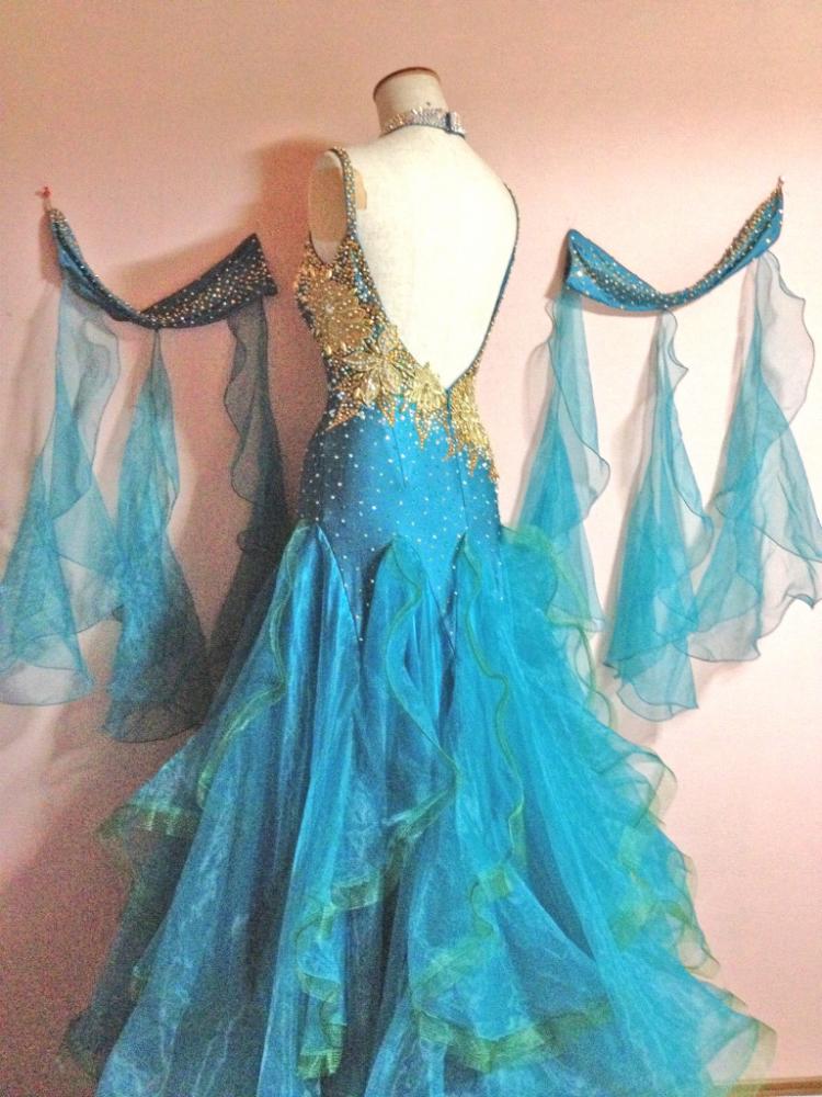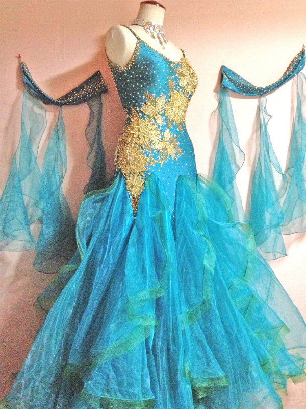 モチーフレースを使って良く目立つドレスです。ボディにはたくさんスワロフスキーのラインストーンを使用しており、スカートのフリルもそれぞれ幅ホースが付き、踊るととてもよく舞います。とにかくとても軽やかなドレスです。ネックレス、手袋、ドレスカバー付きです。