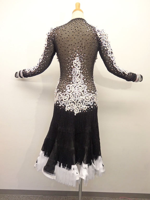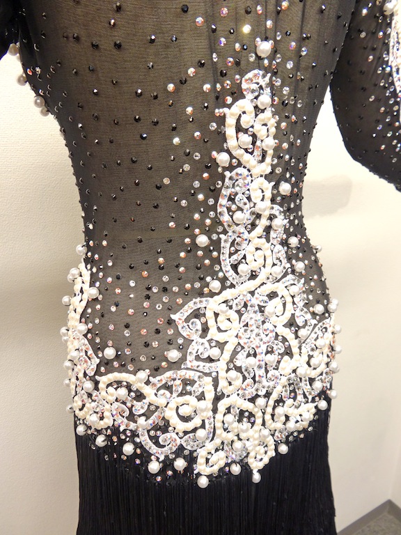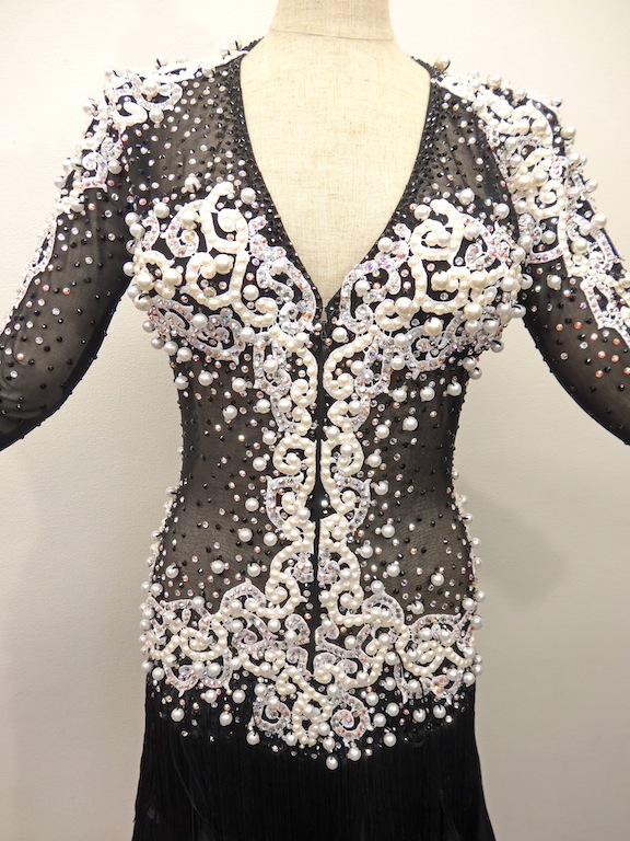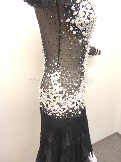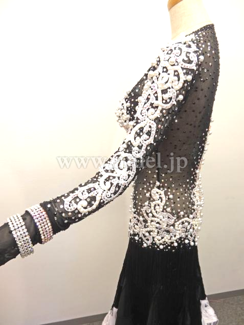 CBMのとてもゴージャスな黒シースルードレスです。ボディにはホワイトのパールとモチーフ、ストーンがたっぷりと使われ豪華に装飾されています。