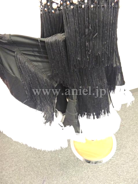 前ファスナーで背中は全て覆われており、長袖タイプですので肌を露出したくない方やタンニングを入れたくない人にもおすすめです。スカートはフリンジが段々に入っています。スリットがいくつも入っていて踊るとよく舞います。