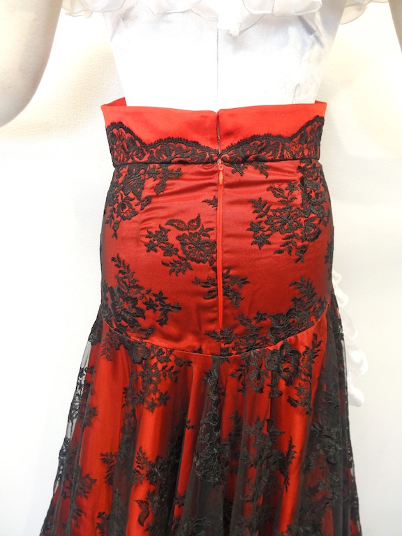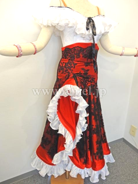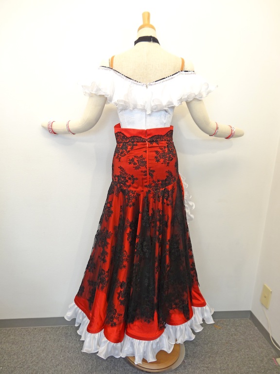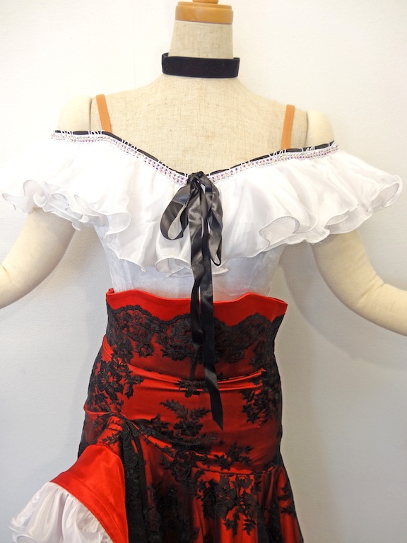 世界プロファイナリストjagodaのスポンサーメーカーのCBMのホワイトのオフショルダーデザインがとても可愛いパソドレスです。スカートは真っ赤な生地に黒の美しいレースが重ねられていてパソドブレの情熱的な雰囲気を醸し出します。裾には白のフリルがあしらわれ動きを大きく見せてくれます。スカートはつまんで上げてありますが簡単に下ろすことができます。