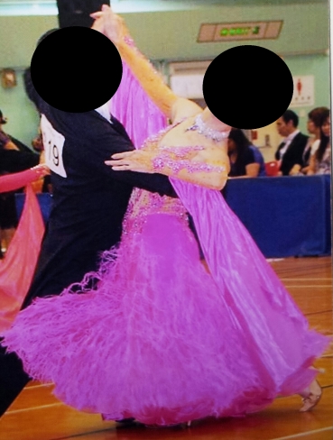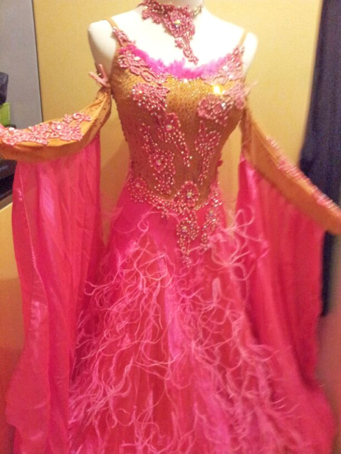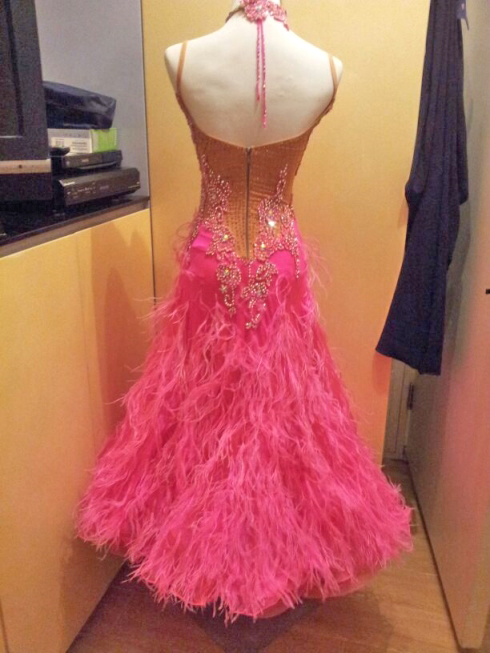 ピンクの可愛いドレスです。ヌーディカラーのボディにモチーフやスワロフスキーストーンがたくさん貼られています。クリスアンの生地にスカートには羽根が使われています。