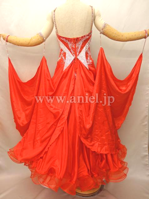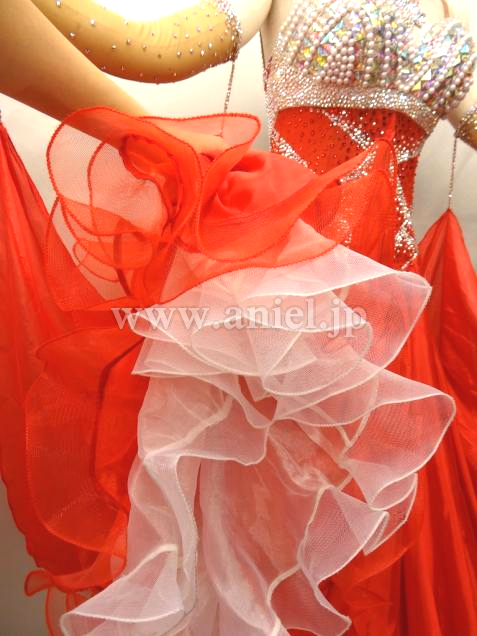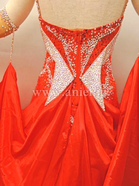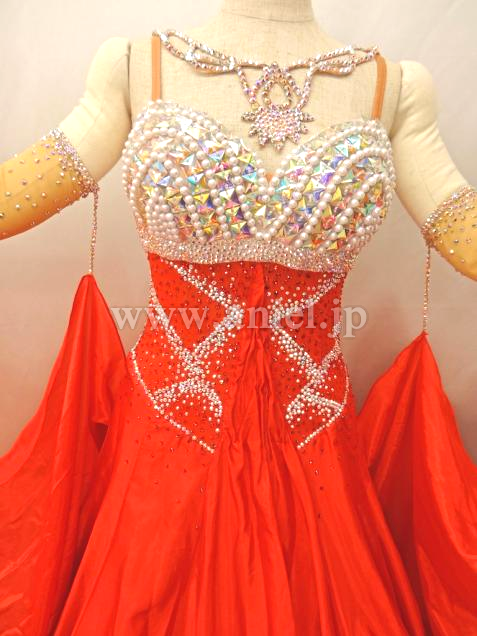 赤の鮮やかなサテンスカートに白のパールの装飾が可愛いドレスです。胸元は大きなストーンとパールがびっしりと使われとても豪華です。ボディにはストーンでラインが描かれています。