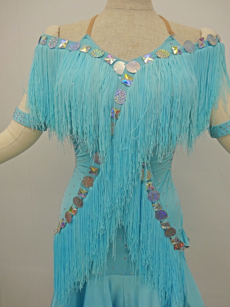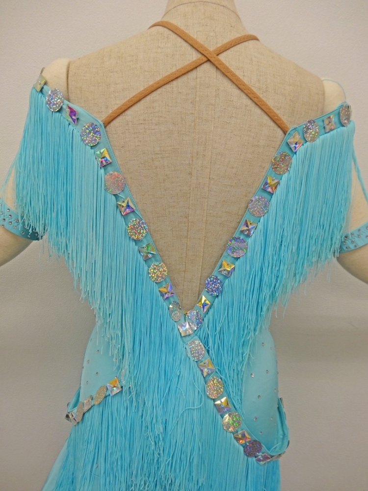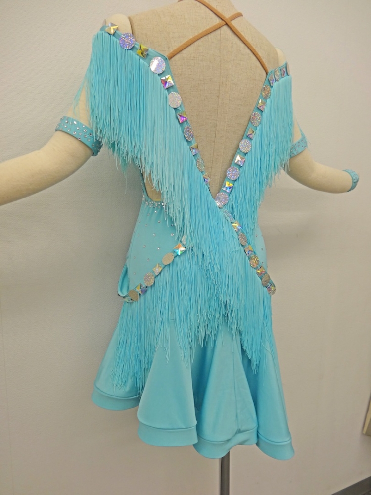 淡い水色のドレスです。細かいフリンジが斜めにかかり、踊るとよく振れます。