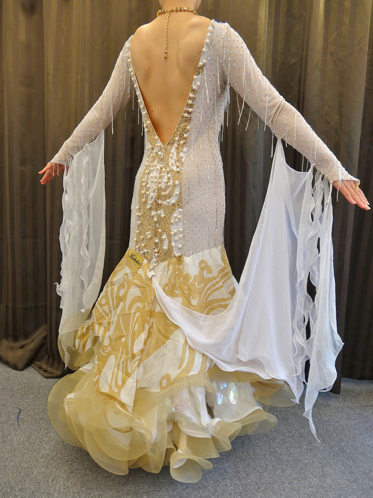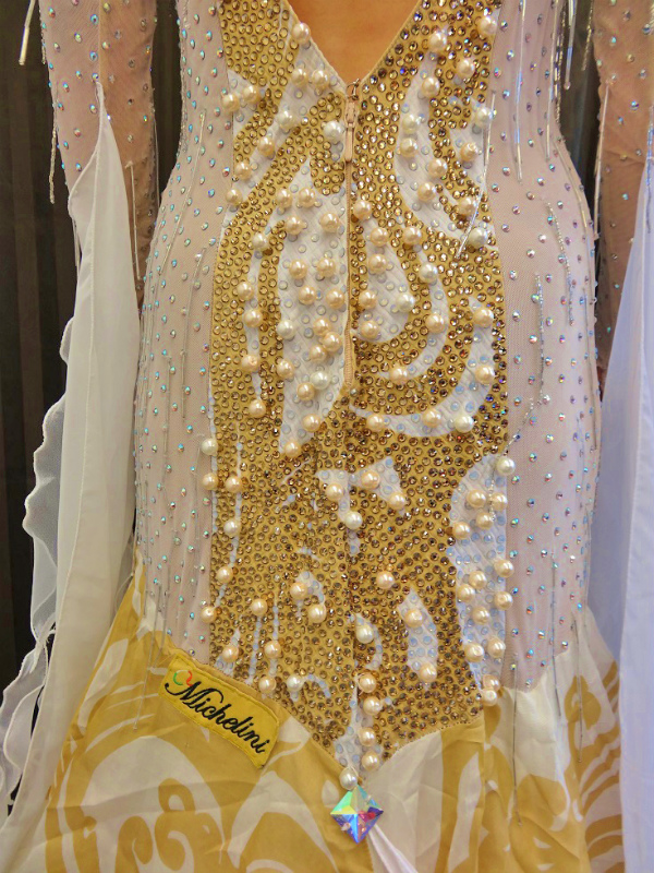 白とベージュの非常に上品な雰囲気のドレスです。スカートには柄布が使われています。ボディには個性的な模様が描かれ、ストーンやパールがびっしりと使われています。