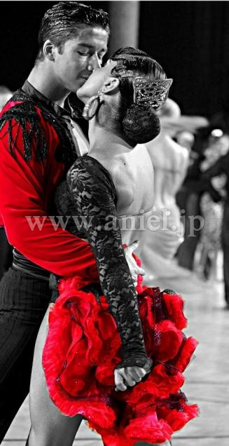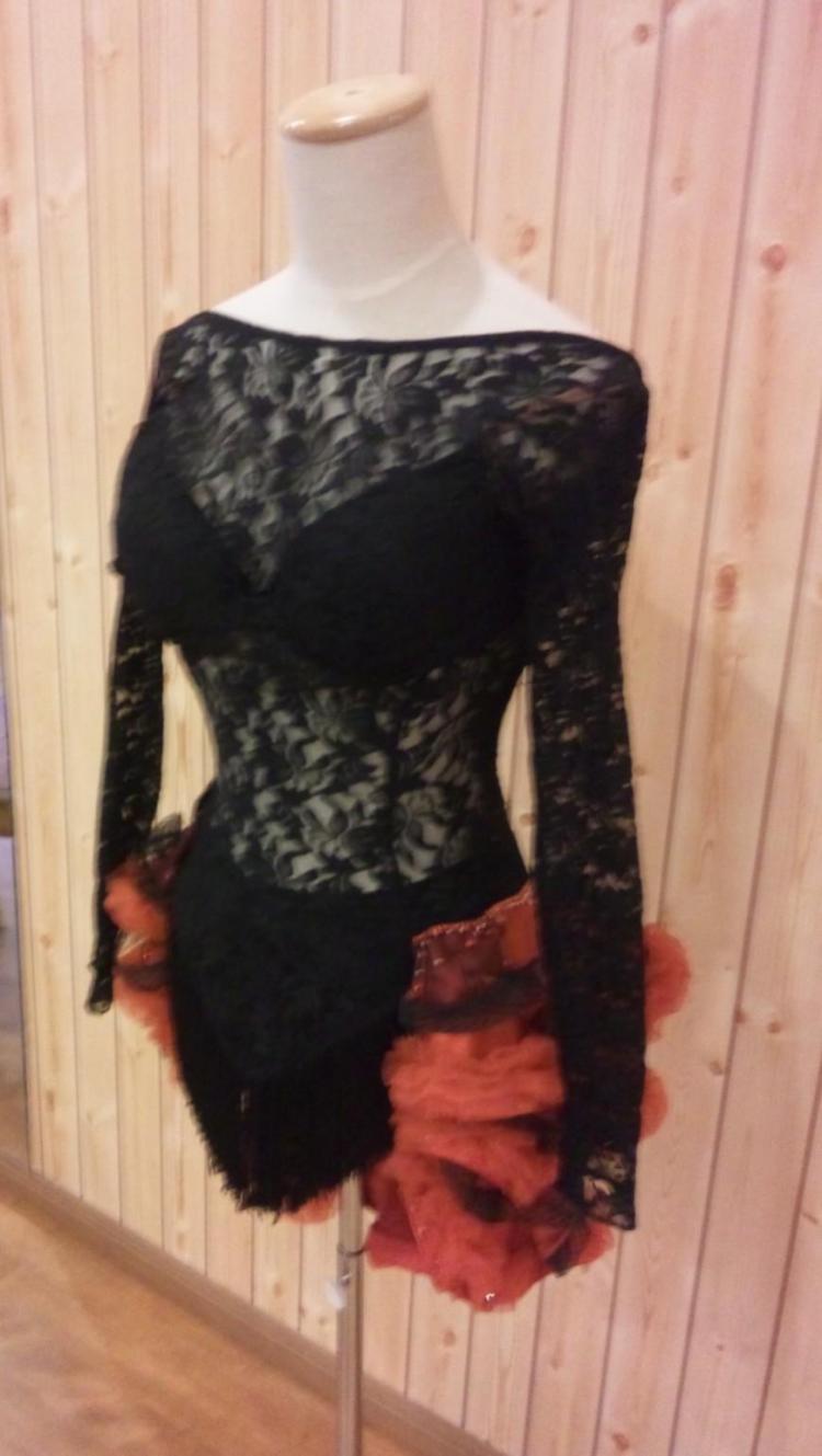 ドイツのアマラテンチャンピオン、ヴィクトリア・タタレンコの赤黒ドレスです。このドレスはセクシーさとスカート部分のかわいらしさを兼ね備えた、非常に評判のよいドレスです。前の部分は長かったのですが、より動きを見せるため、短くしリリアンを加えました。スカートに特徴があり、踊るとよく揺れ腰が高く見えます。使用感がありますので安くお譲りします。ものすごく軽いので、ぜひお試しください!
