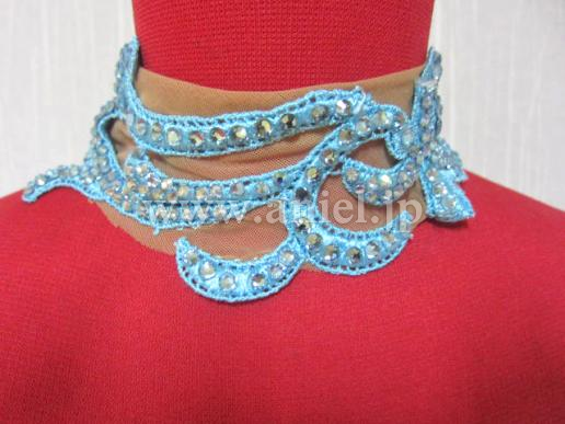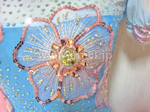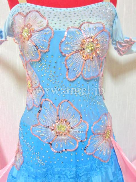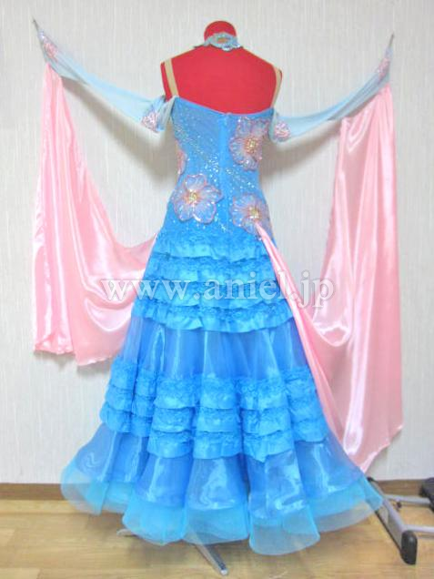 ブルーのフリル(クリスアン社)が段々になった シルエットが素敵なAラインのドレス。エレがんとなラインです。上半身はストレッチが良く効いた生地が使用されてます。着やすさは抜群です。スカートも良く動きます。