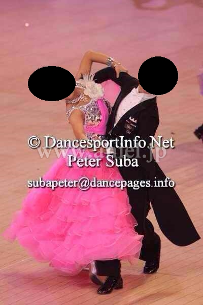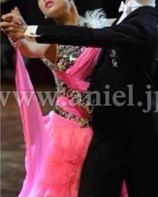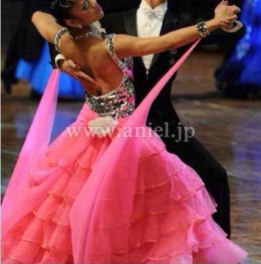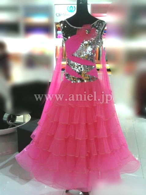 クリスアンの生地が使われたドレスです。ボディはシルバーのスパンコール生地が使われよく光り目立ちます。ショッキングピンクのスカートと良く合う色合いです。スカートは沢山重ねられボリュームがありますが軽くよく踊ります。リボンや花の飾りがヒップや胸元にあしらわれとても可愛いドレスです。