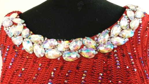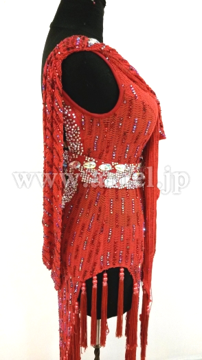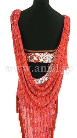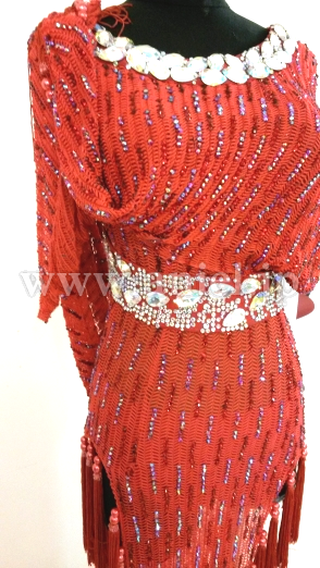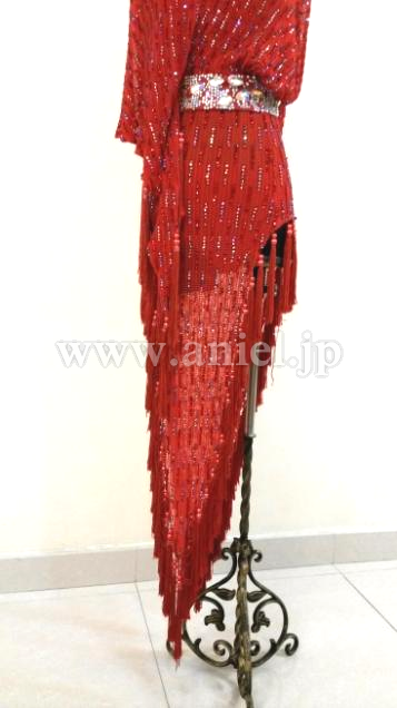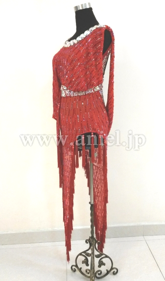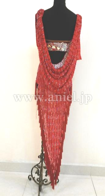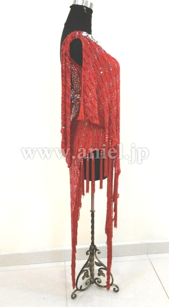 赤の変わった生地を使ったロングラテンドレスです。スカートの裾にはタッセル型のフリンジがたくさんつけられ踊るとよく舞います。ウエスト、胸元、ヒップまわりにたくさんのスワロフスキーストーンが使われています。