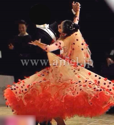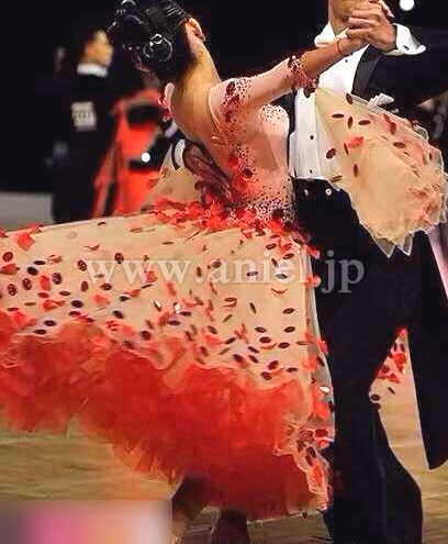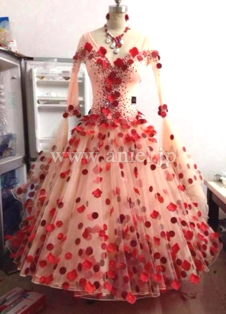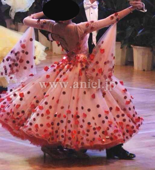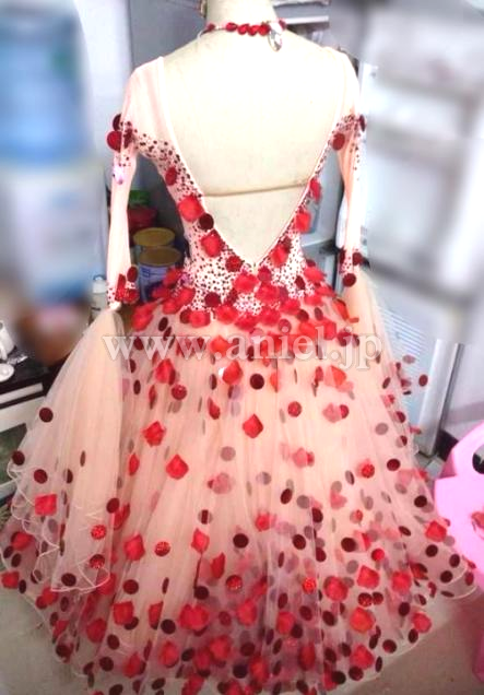 とてもインパクトのあるデザインのドレスです。クリスアンのシャンパンベージュの生地にハンドメイドの赤い花びらと大きなスパンコールが一面に散らされていてとても華やかかつ目立ちます。