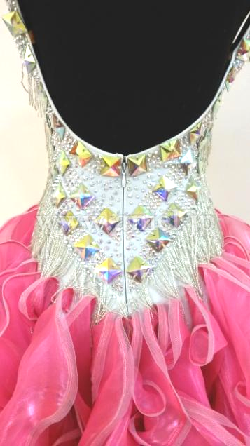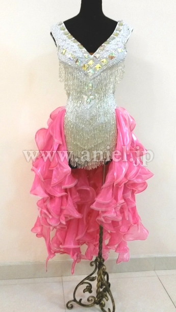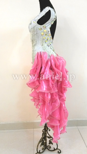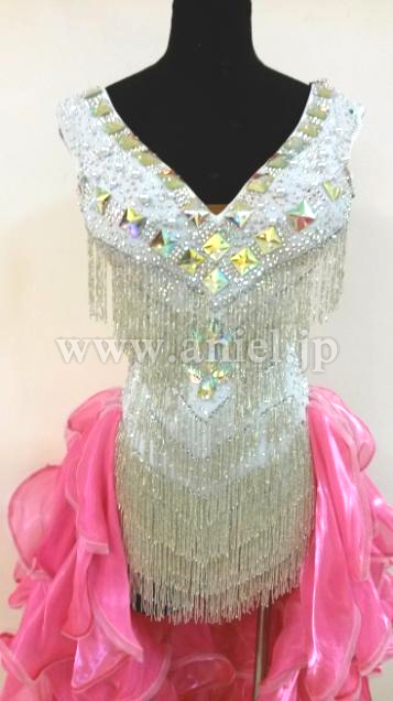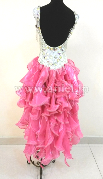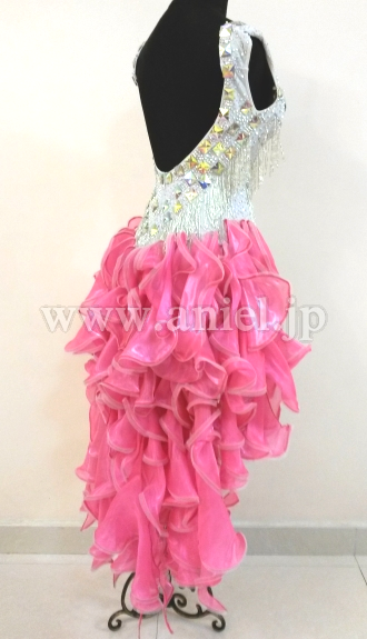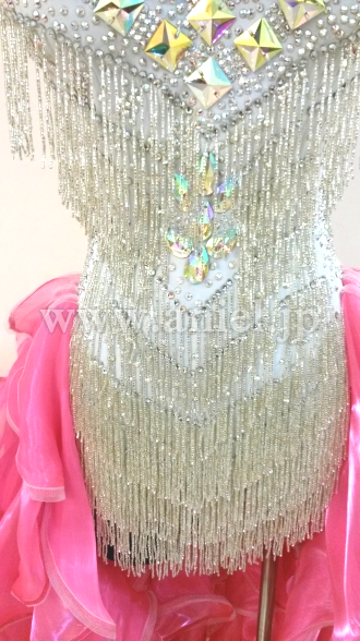 ボディはスワロフスキーストーンとクリスアンのシルバーのフリンジがびっしりとほどこされ光り輝きます。お尻の方のフリルがたくさんつけられたスカートはよく踊りフロアで目立ちます。