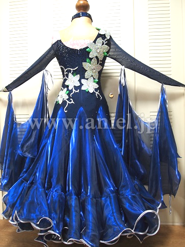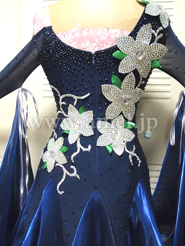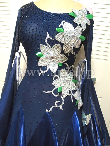 お花がインパクトあります 何十にも重ねた裾のフリルの全てにサテントリミングが。ボデイーもAB クリスタルで埋め、お花はシルバーの石で埋め尽くしました。スカートがとても豪華に踊ります。