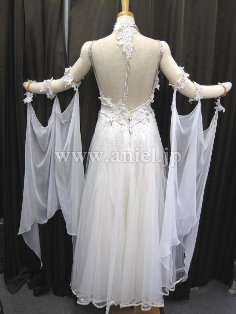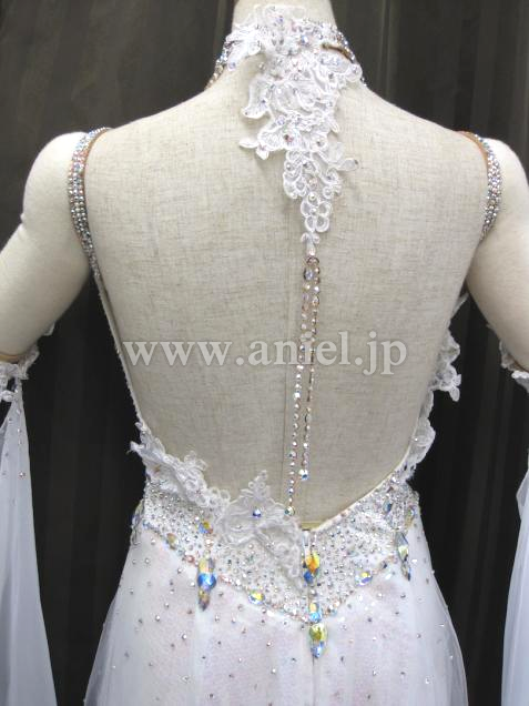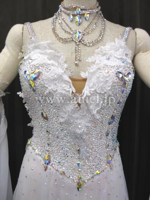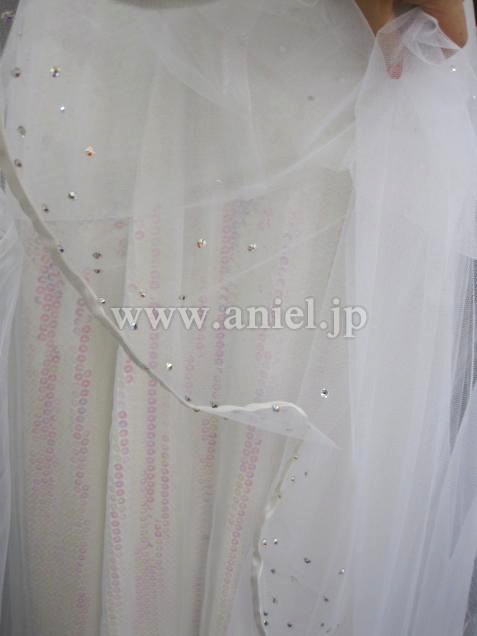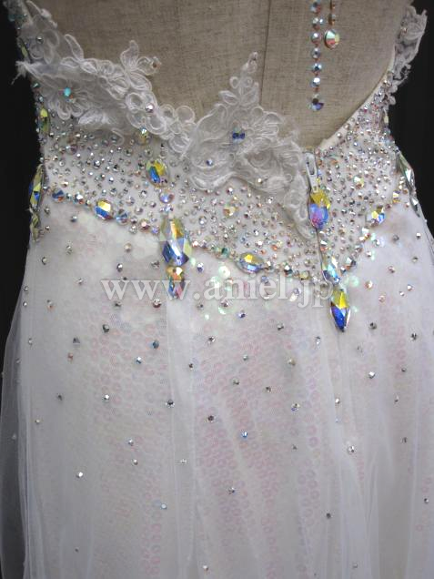 繊細なレースがバングルや胸元を飾ります。スカートは1番上がチュール、下にはオーロラのスパンコール生地が使われ光が当たると美しく輝きます。