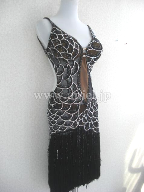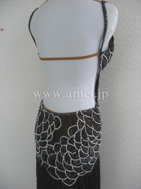 すべてスワロフスキーで本当にびっくりするほどの装飾です。スカートのフリンジにも特徴があり、こちらにも石がいっぱい付いています。胸元があいていましたのでネットを簡単に取り付けてありますがすぐに外せます。大きいビースと黒いゴムの様なブレスレットが付いています。購入時に付けていただいたネックレスもそのままお渡しできます。