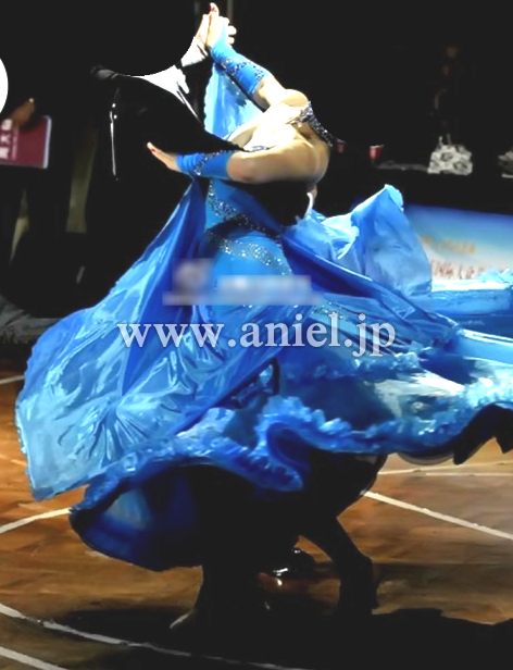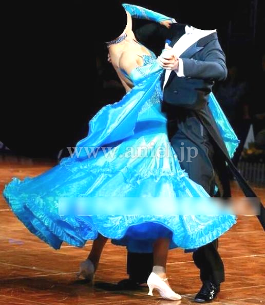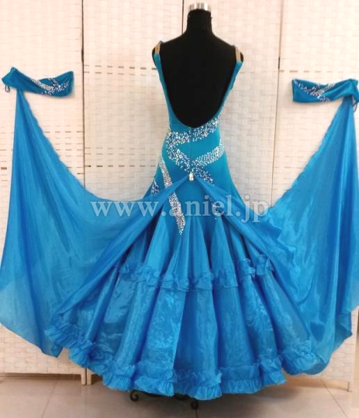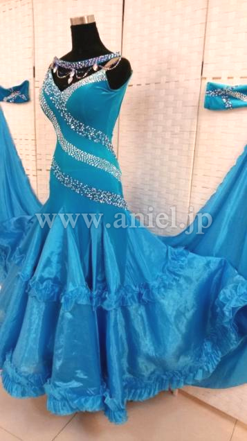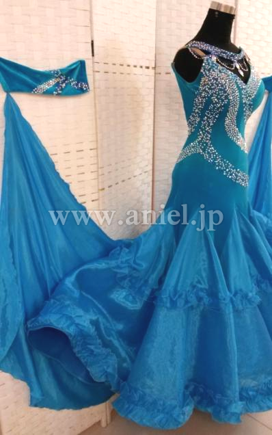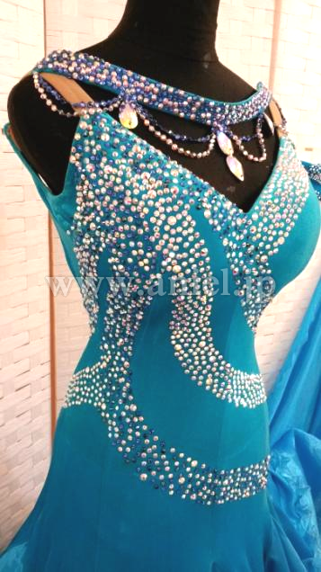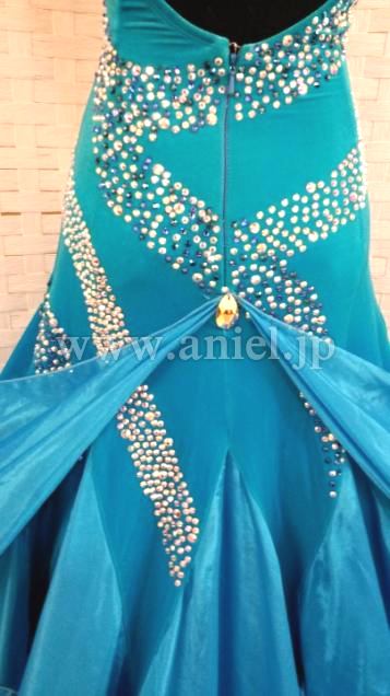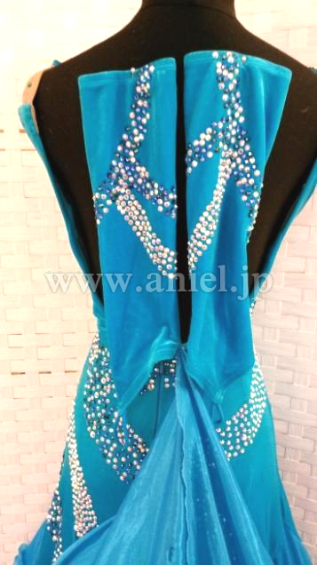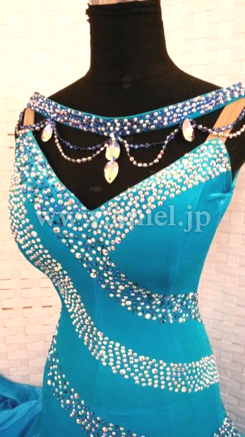 クリスタルクローバーの美しい青の生地が使われたドレスです。胸元やボディはスワロフスキーストーンで豪華に装飾されています。ボディにはベルベット生地が使われています。