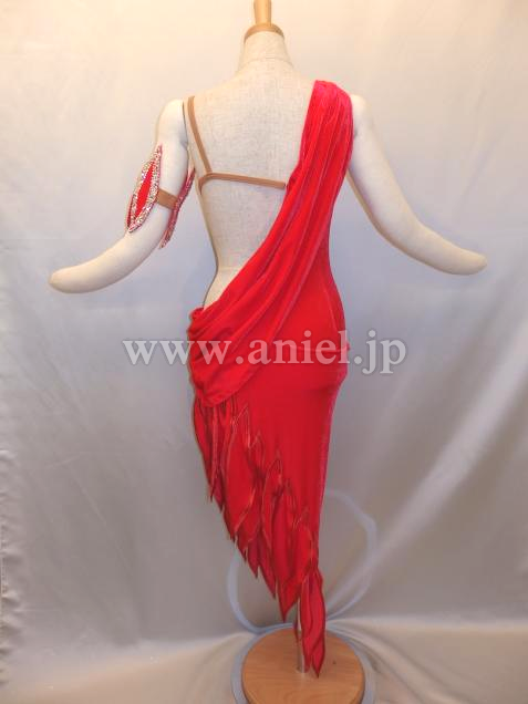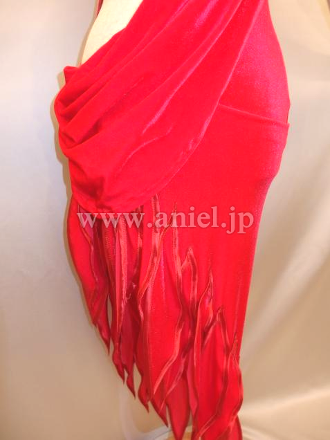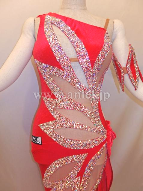 上品なベルベットのような光沢のある赤い生地にベージュの布で個性的な模様がくり抜かれています。模様の周りにはストーンがびっしりと貼られとてもよく輝きます。フロアでとても目立つドレスです。