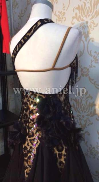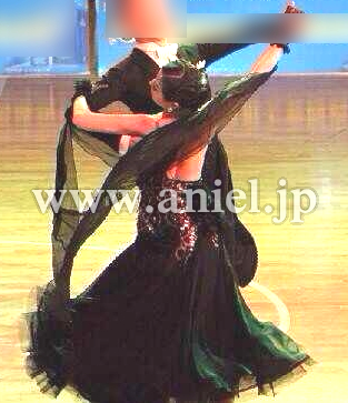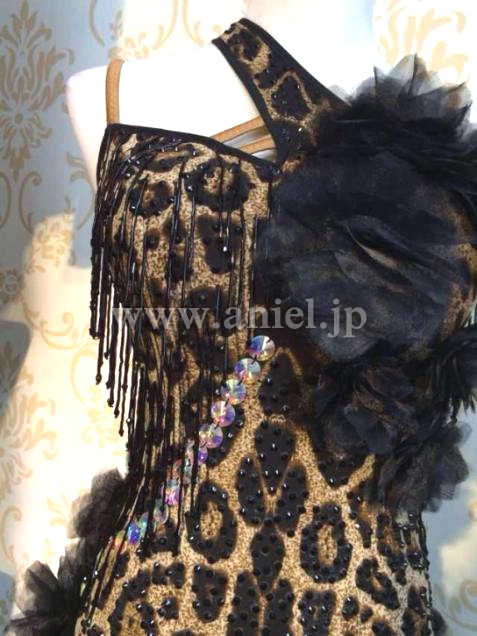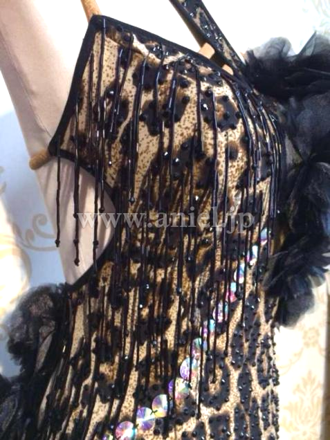 黒のスカートに、ボディには立体花モチーフやビーズフリンジが装飾されています。キュートなショートグローブに大きなシフォンのフロートがよく舞います。