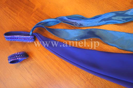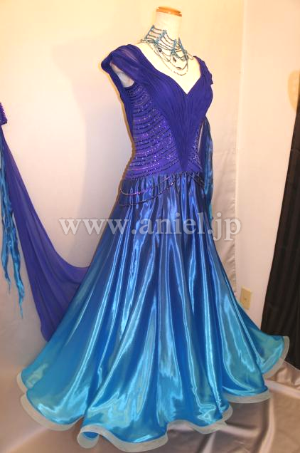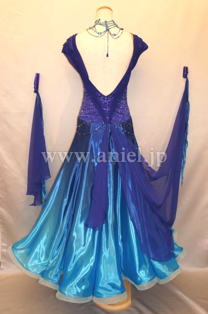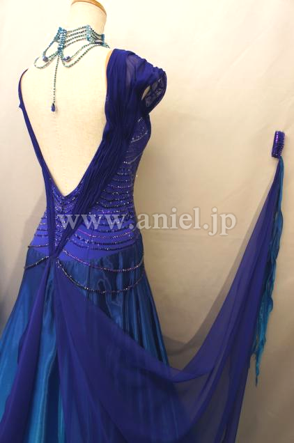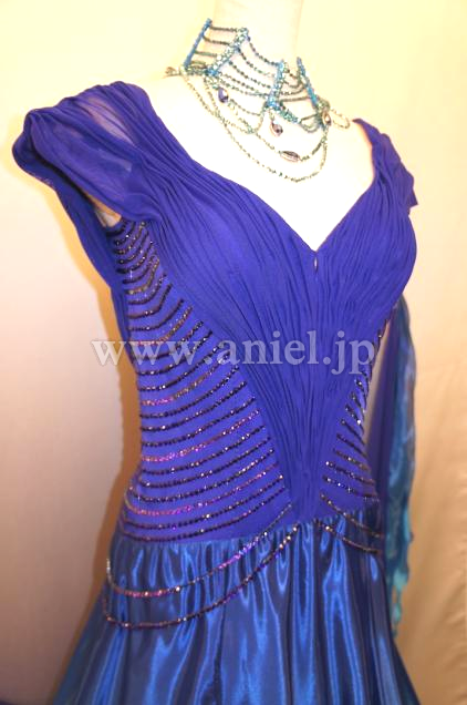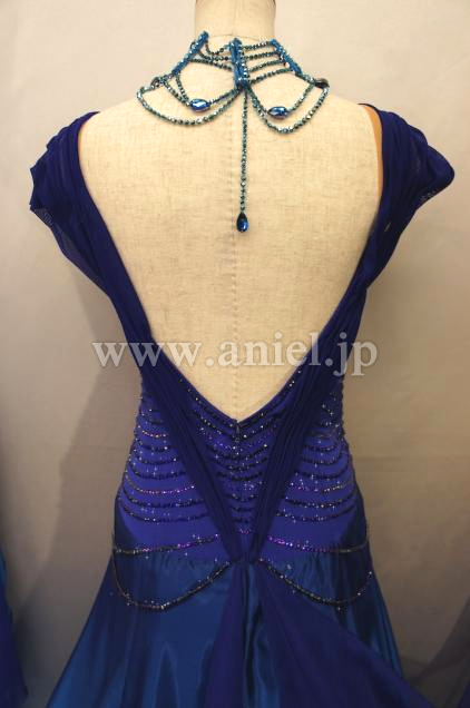 ボディにはスワロフスキーが何連にも連なって描かれており、とてもエレガントな印象です。スカートは青〜水色のグラデーションとなっています。ネックレスも豪華です。