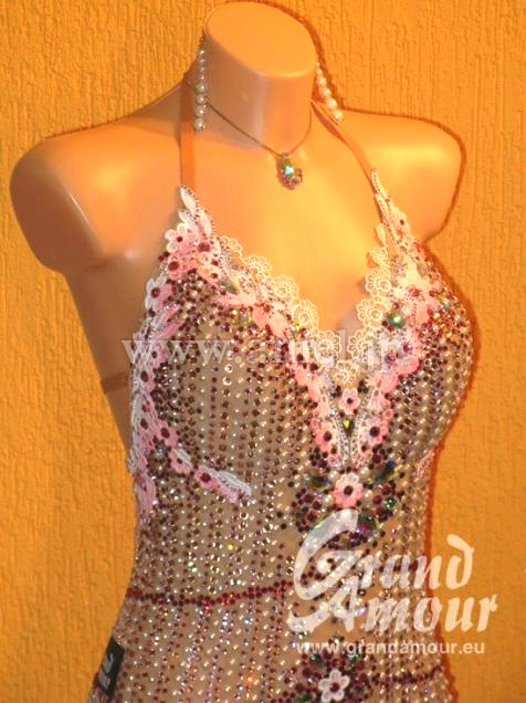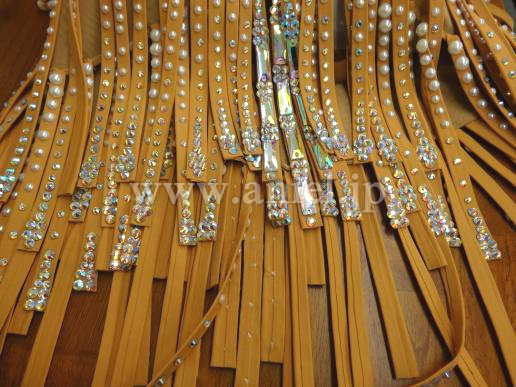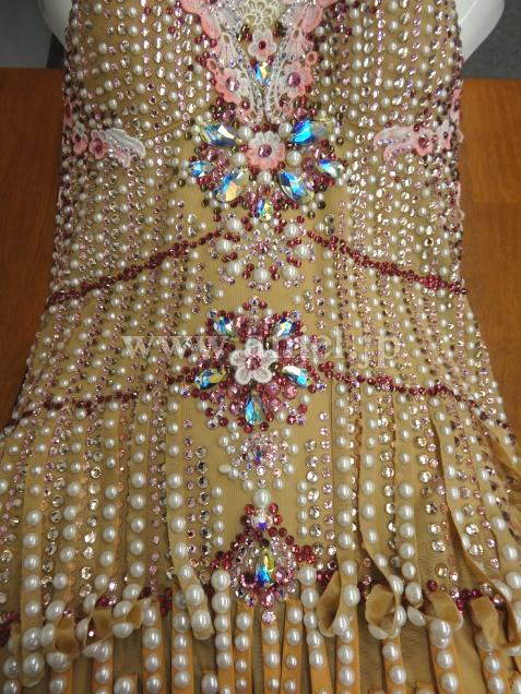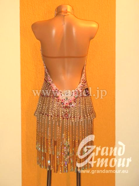 割とゆとりのあるタイプのドレスです。新品ですが1年以上前のドレスのため値下げします。ランジェリーのようなヌーディでセクシーなスタイルにびっしりとストーンとパールでデコレーションされている大変セクシーなドレスです。布が少ないですが、スカートがすべて布フリンジ、さらに石がびっしりついているので適度に重さもあり、意外と動きはよく見せてくれるドレスです。ジャイブやチャチャなどの軽快な曲に合うと思います。一味違ったデモの衣装としていかがでしょうか?