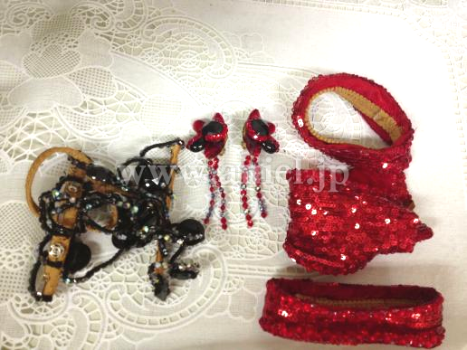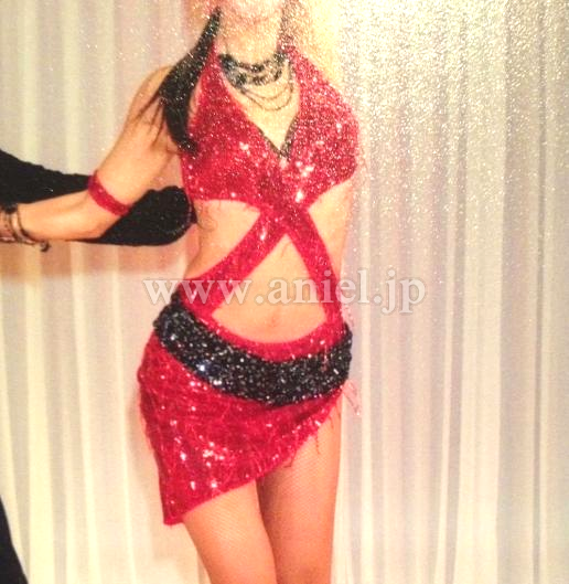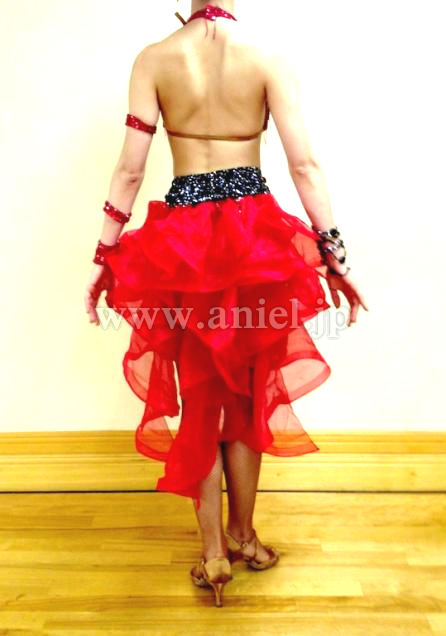 黒いベルトには隙間なくストーンが貼られ、石落ちはほぼありません。赤い部分も全面が輝く上に、竹ビーズが付けられています。 スカートのパニエは取り外しができ競技によって印象を変えることができます。 赤いイヤリング、黒いネックレス、両腕にブレスレット付き。