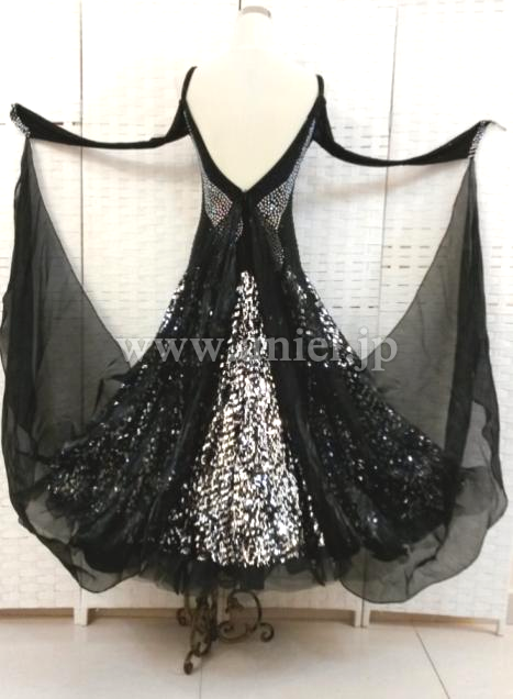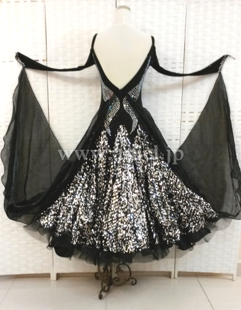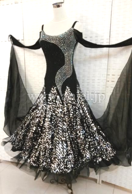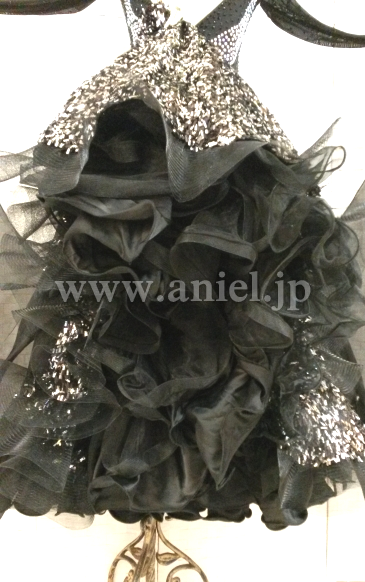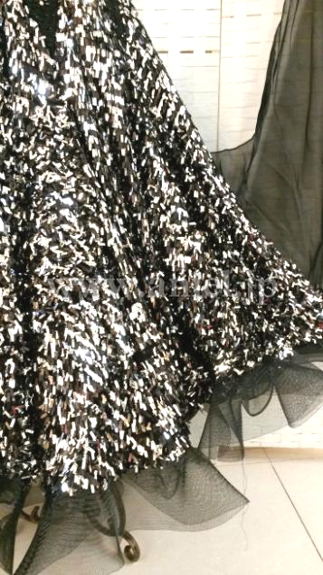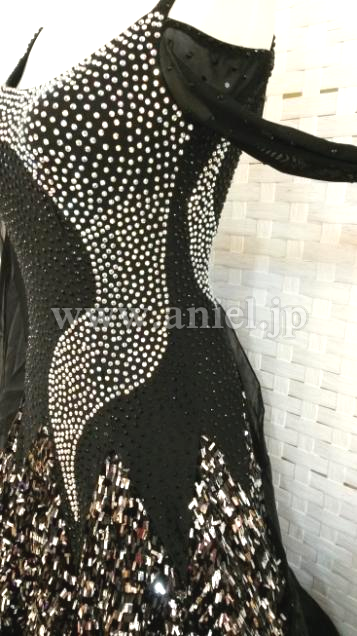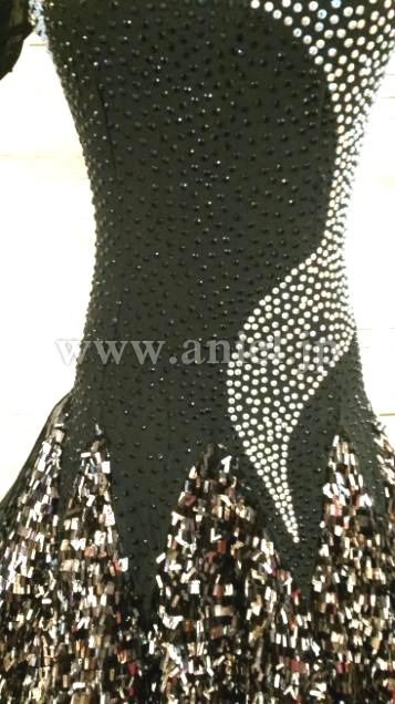 ストーンはボディを引き締めてみせるような流れるラインを描いています。大量のストーンとスパンコールでとてもよく光り目立つドレスです。