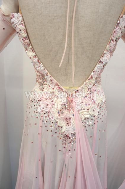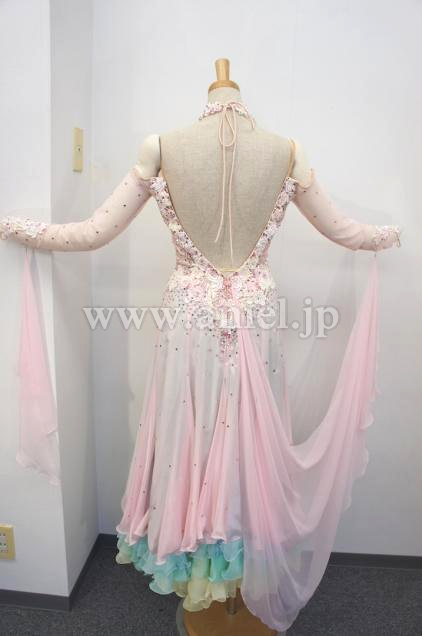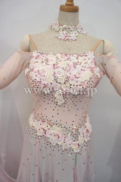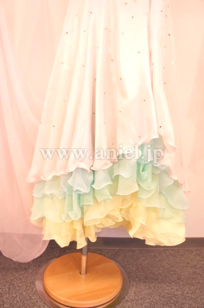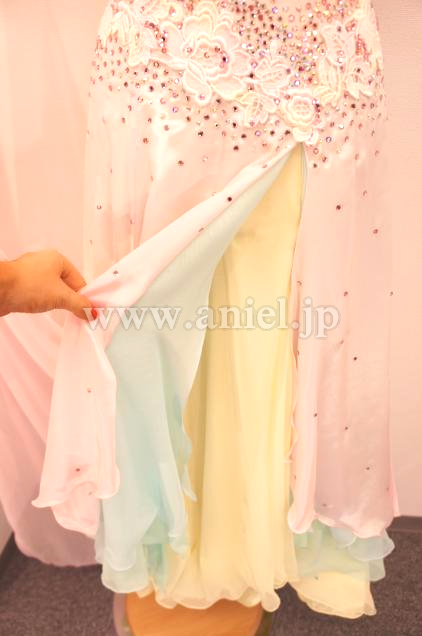 淡いピンクの生地にカラフルなインナースカートが清楚で可愛らしいイメージのドレスです。