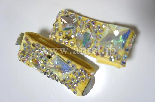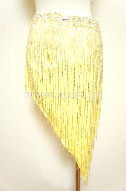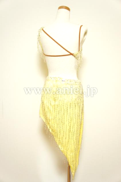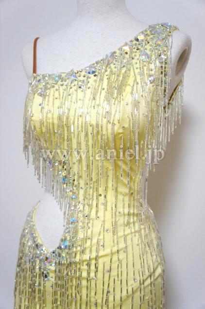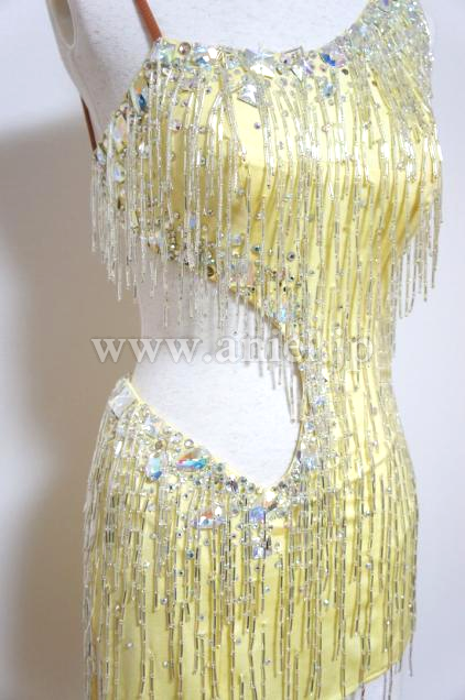 可愛らしい黄色のボディにビーズフリンジがたくさんつけられたドレスです。大粒のストーンもたくさんつけられ踊るときらきらと輝きます。
