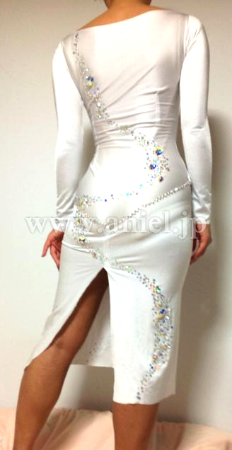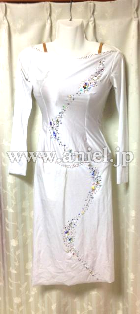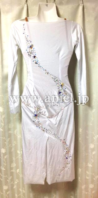 白のドレスですが、新品できれいな状態です。インナーにベージュのレオタードが内臓されています。後ろスリットです。