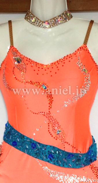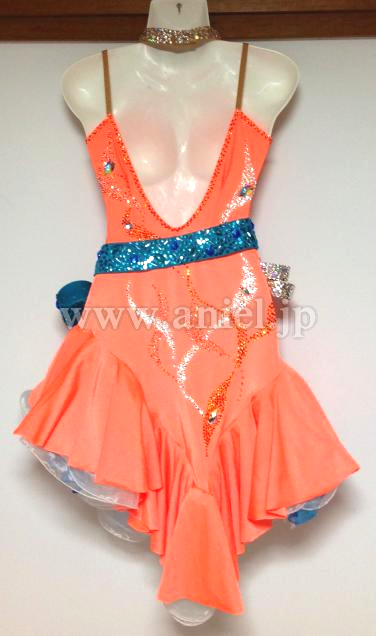 蛍光オレンジとブルーのインパクトの強い配色です。スカートはボリュームが多く、どなたでも着られるデザインだと思います。付属品はブレスレット3個、チョーカーです。