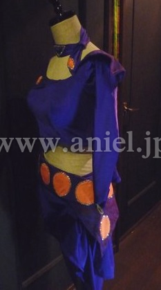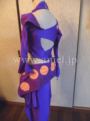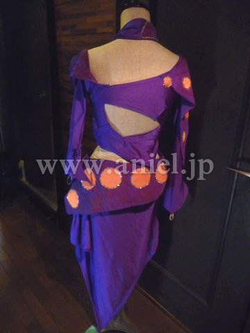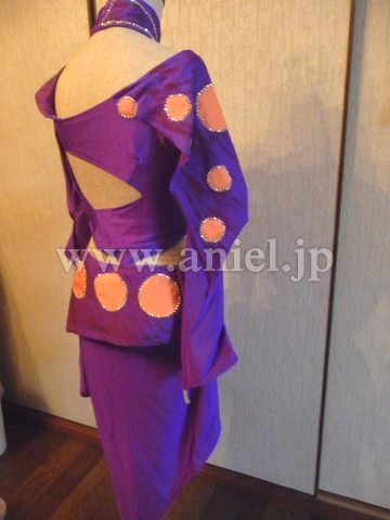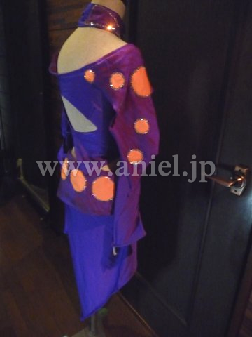 紫色とオレンジの配色とかわいい水玉がとても目を引きます。ほかの人との違いを際立たせ個性的な方にぴったりです。適度におしりも隠れて着心地、踊り心地の良いドレスです。