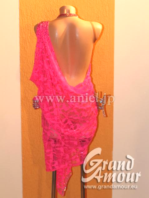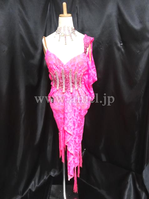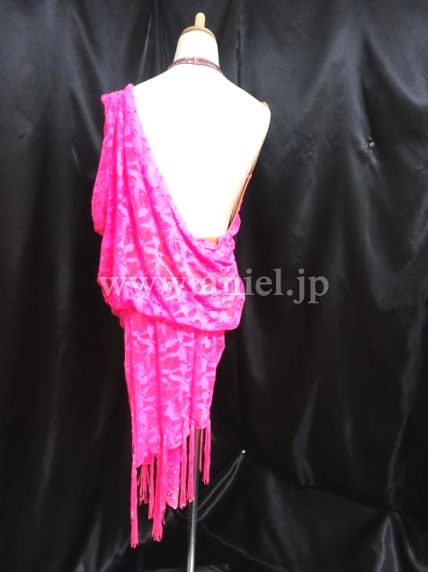 ネックレスと腕輪が付いていません。シルエットがとても美しいです。すこしゆとりのあるデザインですが、コルセット型の部分で絞りが効いているので、ウエストは細く見えます。とても発色のいいピンクです。新品ですが、搬送の際にアクセサリーを紛失してしまったため、もともと21万だったところをこのお値段におさげして販売しています。また、日本に入ってくる前にデザイン変更されて、フリンジは裾に付いています。(写真参照)