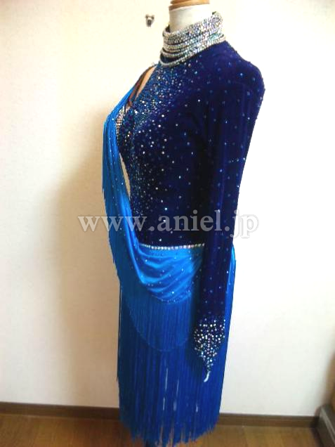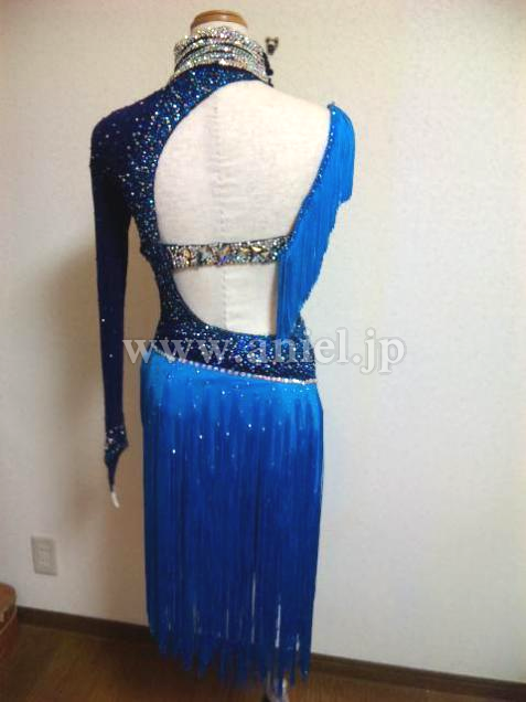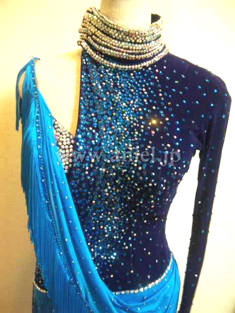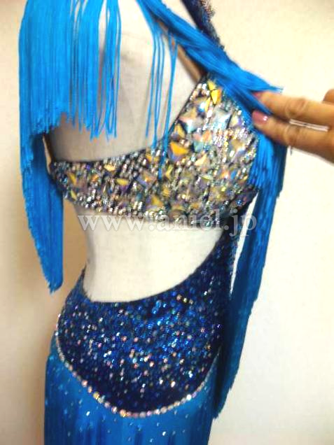 ボディにはたくさんの石が貼られとても豪華です。露出も適度で動きのあるドレスなのでいろんな種目で使えると思います。 身長に合わせてフリンジはカット可能です。
