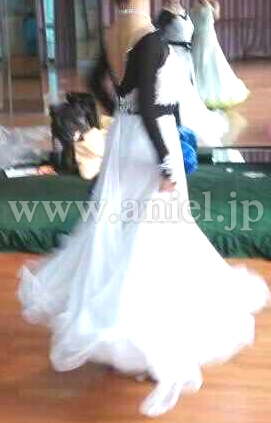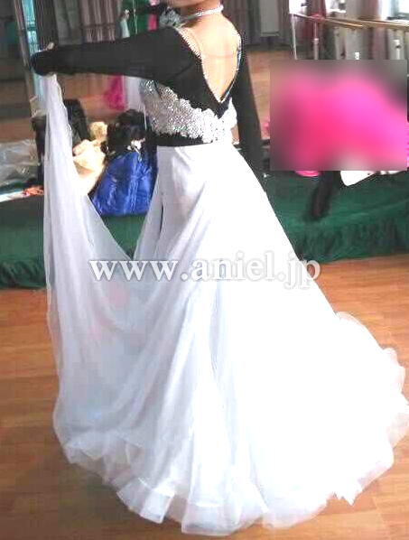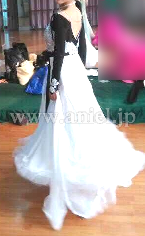 ボディのモチーフにはチェコ製のストーンが貼られ、ネット生地の黒の長袖とウエストのリボンが目を惹きます。