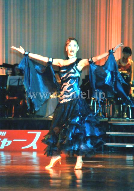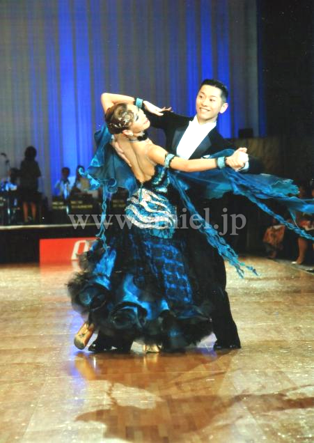 ジェイドカラーにオーロラの石がびっしりついていて強めのデザインが映えます。あまり使われない色とデザインなので、フロアでも目立てます。スカートも大きく広がり、よく舞うドレスです。