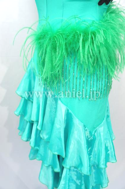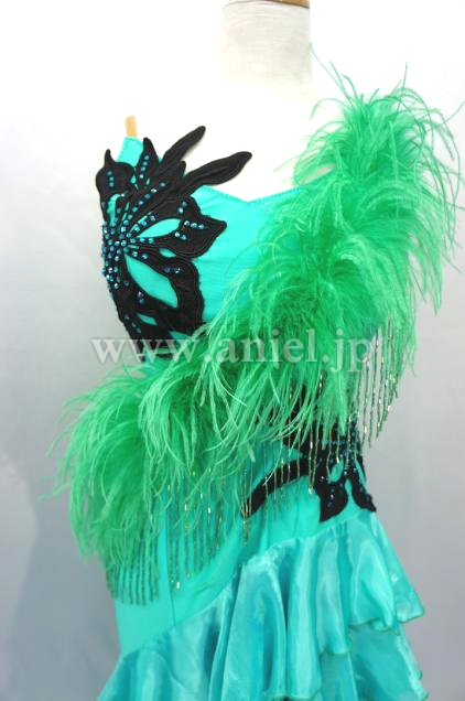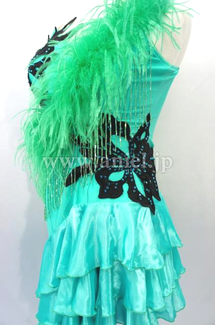 肩からななめに羽根がつけられその下にはビーズフリンジがつけられ踊るとよく舞い、光りに当たるとキラキラと輝きます。