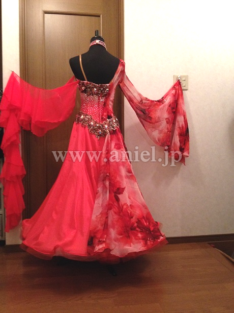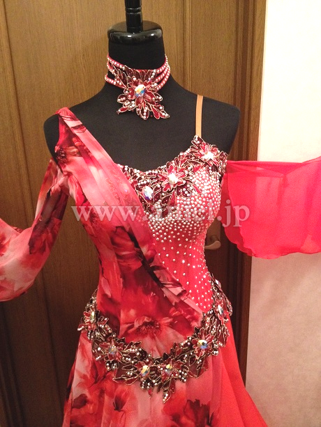 写真は暗めの照明ですが、実物は鮮やかなフレームレッドで、ストーンは全てスワロフスキーです。