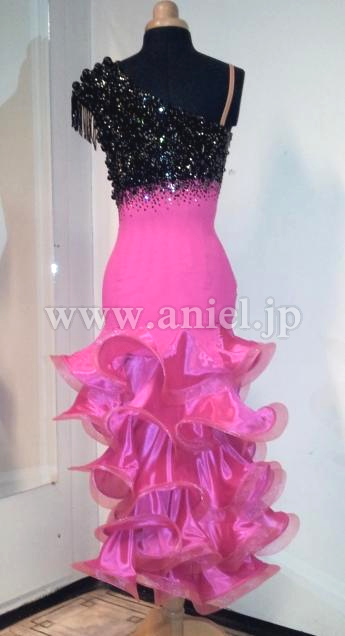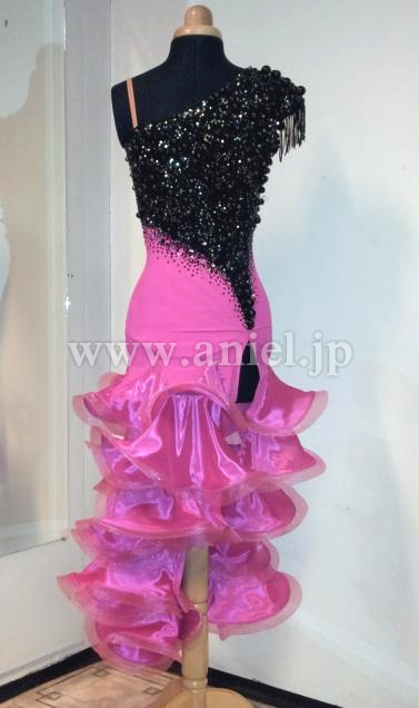 ショッキングピンクと黒の組み合わせがキュートながらも強さが見えるドレスです。