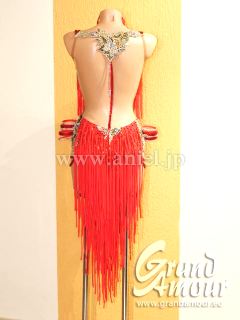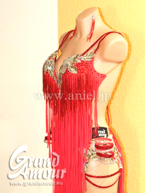 発色のいい明るめの赤にゴールドの装飾がゴージャスなドレスです。胸元にビーズフリンジ、ボディ全体が布のフリンジが付いています。布フリンジのため軽く、よく踊ります。両足がすべて出るデザインです。レオタードのパンツがハイレッグになっているため、足が長く見えます。腕輪とピアスが付属しています。状態は新品同様で非常にきれいです。