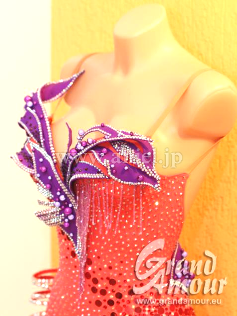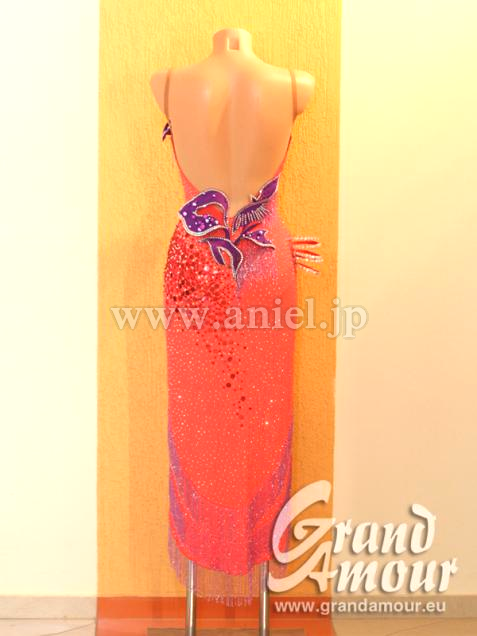 タンゴフレアのライクラ生地にびっしり石が付けられた非常にゴージャスなドレスです。裾の方にビーズフリンジが付けられているので、フロアでも華やかに光ります。胸とお尻に芸術的な3Dモチーフが付けられています。ロング丈ですが、152センチくらいの方から着ていただけます。