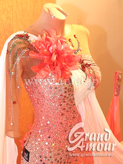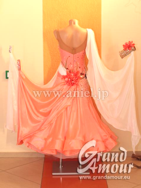 サーモンピンクと白のとても上品で可愛らしいデザインです。ボディにはびっしり装飾が付けられており非常に豪華です。胸とお尻に3Dのお花のモチーフが付けられております。背中があまりあかないデザインとなっておりますので、露出を気にされる方にもお勧めです。ワルツやスローにいかがでしょうか。