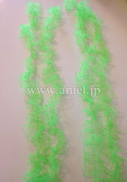 胸の部分から上腕にかけて、緑のチュールと白のレースを使った花のモチーフが連なり、