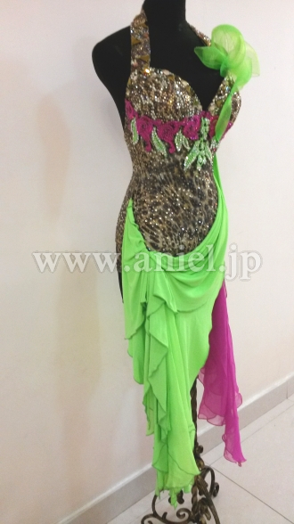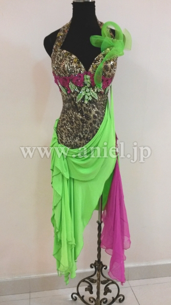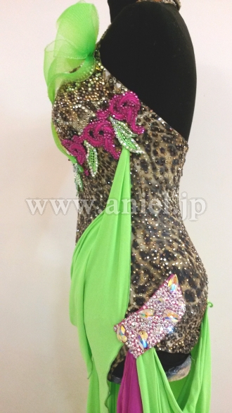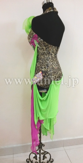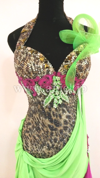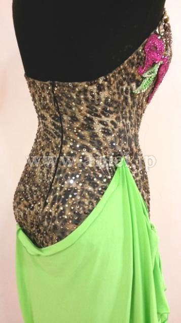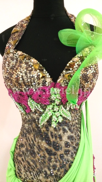 ボディにはスワロフスキーストーンがたくさん使用されていて、特に胸元からホルターネックの紐までびっしりと貼られています。