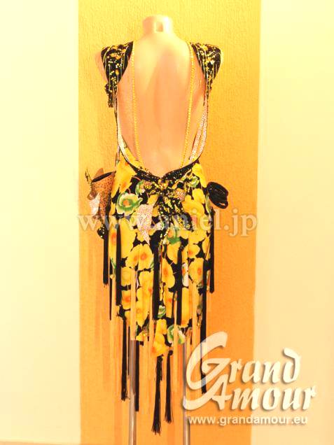 鮮やかな黄色に花柄の個性的でゴージャスなドレスです。
