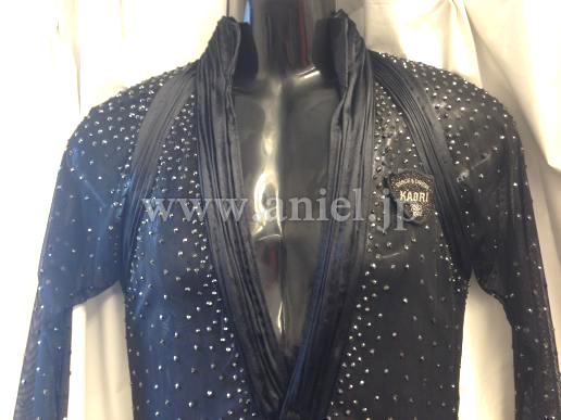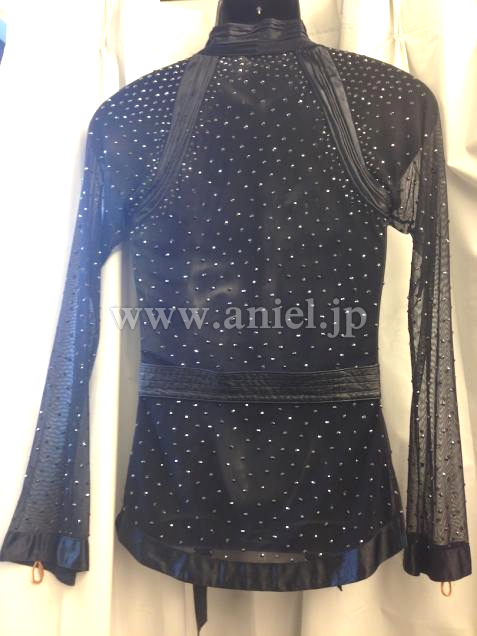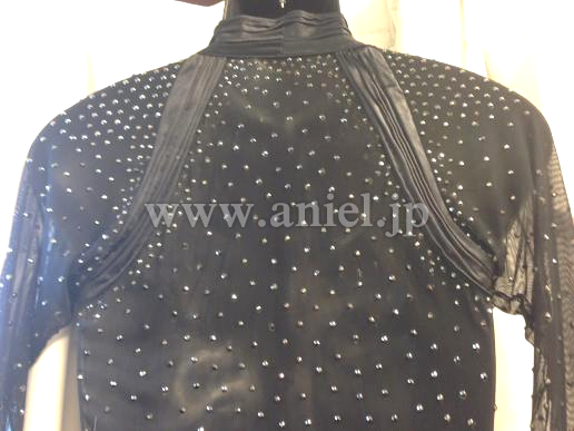 ベースはシースルーで襟、袖、裾、切り返しはサテンを使用しています。ベルトがアクセントになりスタイルよく見せてくれます。石がたくさんについているので会場でかなり目立ちます。