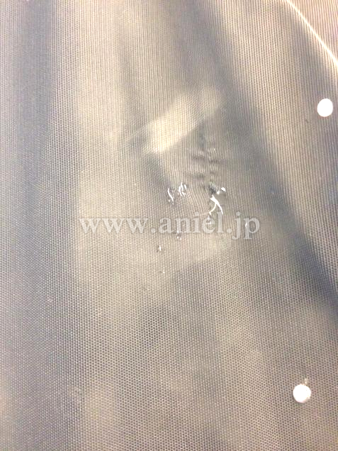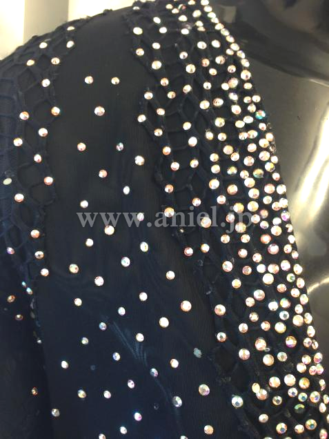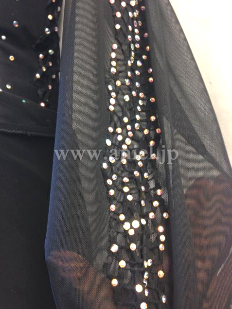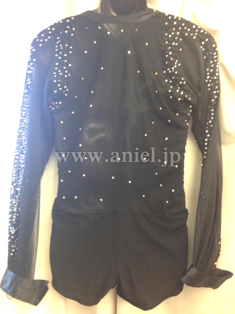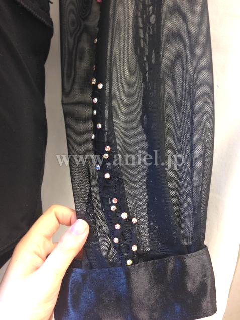 シースルー素材にネット生地をアクセント付けしてしてあります。石がたくさんついているので会場で目立ちます。ゼッケンを着けた際に穴があいてしまいました。繕っており競技選手なら問題ないと思いますが、ご了承下さい。