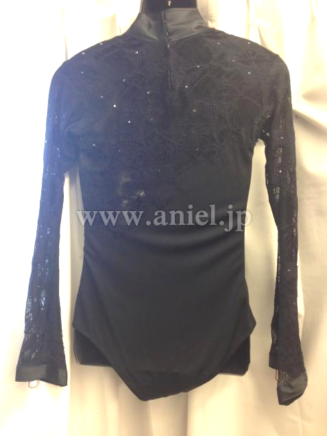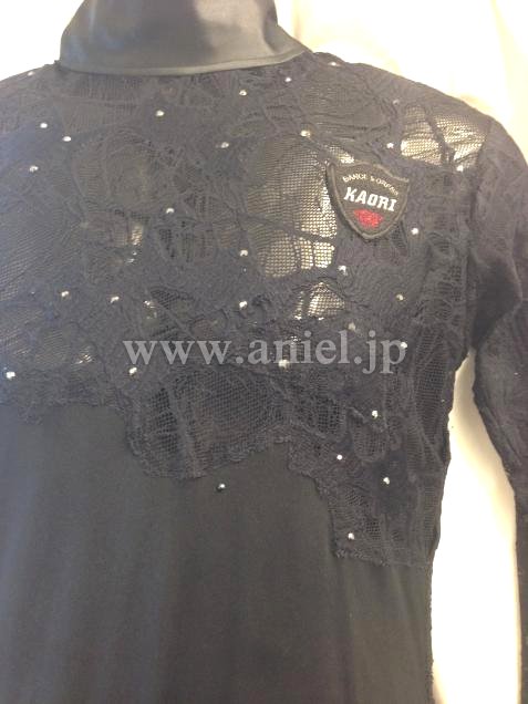 ネックまわりはサテン。上半身と腕は柄のネット生地です。石も少しついています。手足が長く見えるデザインです。少しサテン部分にタンニングがついていますが、目立ちません。ネットに入れて洗濯機で洗えます。