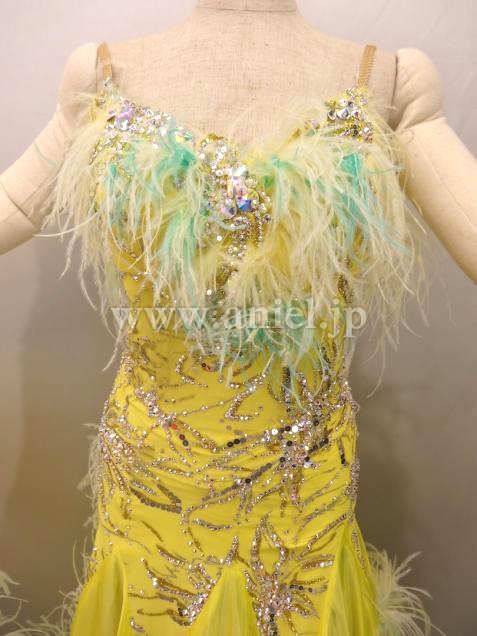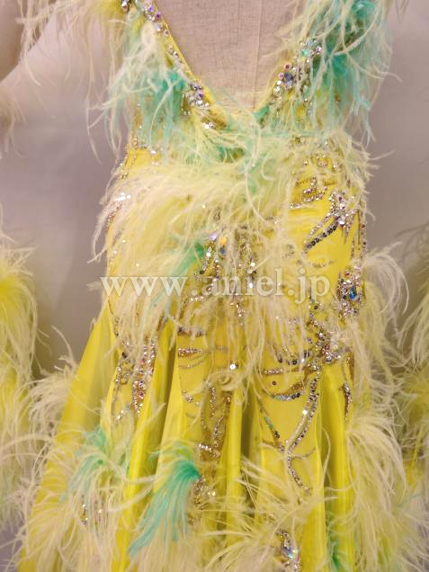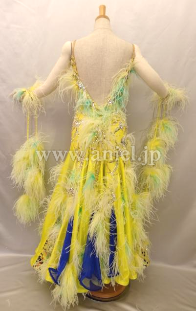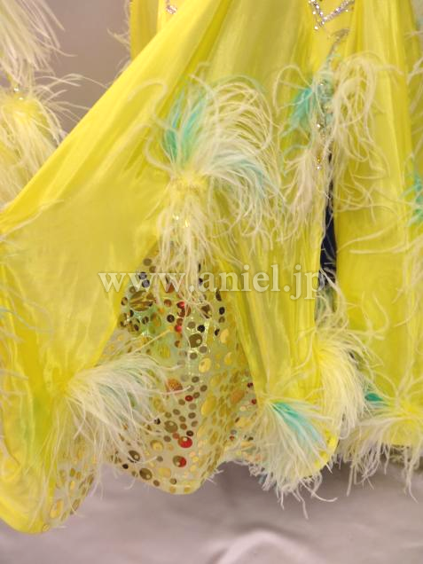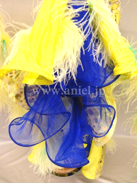 スカートは凝った作りになっていてパネルにはスパンコールがたくさん貼られた光沢のある生地が入れられスリットからは濃い青の生地が覗くようなデザインになっています。